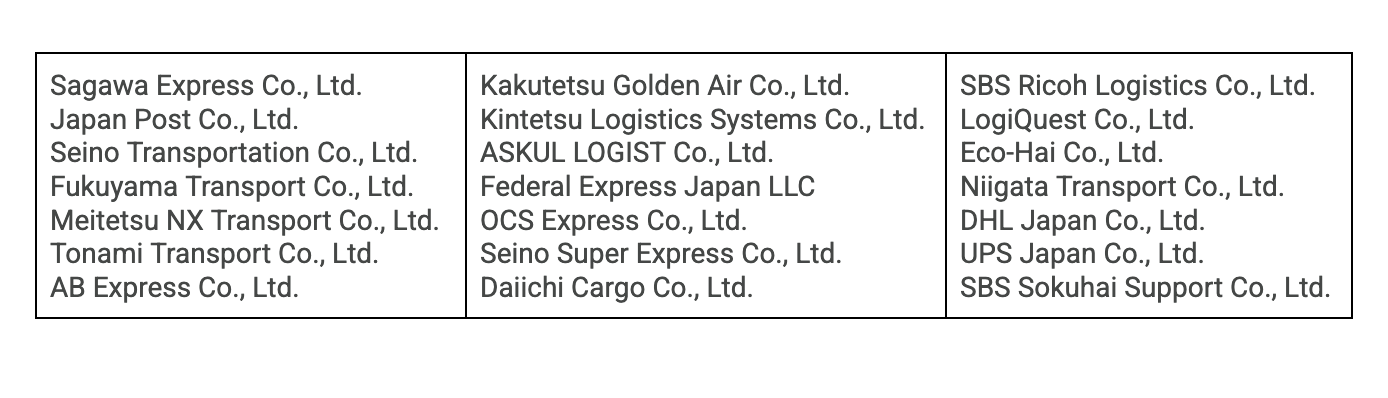 Important Note: Below is a list of delivery companies partnered with Takanawa Gateway, no prior permit application is required when using these service companies. Pre-delivered items will incur a storage fee. Up to three items are free; from the fourth item, a fee of ¥500 (excluding tax) per item applies. If shipment is delivered on May 27th, no fee will be charged. If not using the delivery companies listed below, items cannot be delivered in advance, and the shipping company must deliver items directly to the designated room using the delivery route, requiring prior vehicle registration.